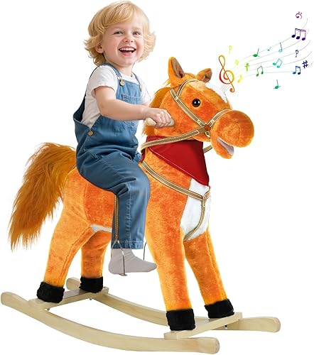 Rocking Horses Ages 1-3, Plush Ride on Animal with Wooden Rockers, Moving Mouth and Wagging Tail, Musical Sounds, 110lb Weight Capacity Light Brown Large