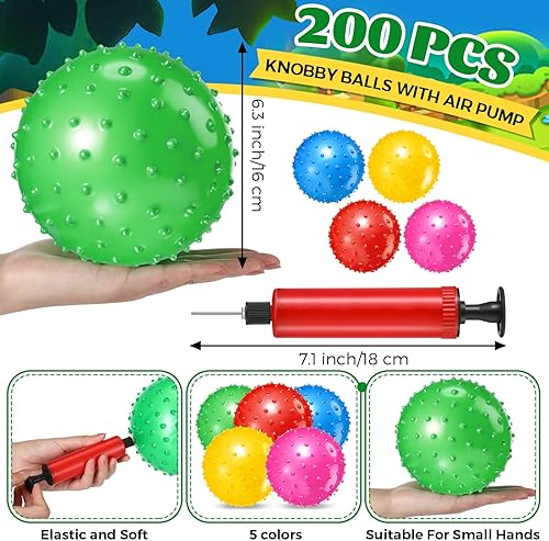 Lenwen 200 Pcs Knobby Balls 6.3 Inch Soft Bouncy Balls Bulk Inflatable Sensory Toys with Air Pump Spiky Massage Stress Toys Bouncy Party Favor for Kids Baby Toddlers Playground Backyard Pool, 5 Color