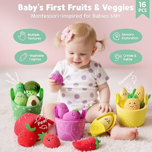 Montessori Baby Sensory Toys – 16 PCS Plush Fruit & Veggie Color Sorting Play Food with Crinkle & Rattle, Baby Toys 6-12 Months, Learning Toys for 1 Year Old Boys Girls Gifts
