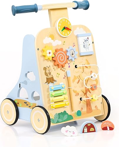 Beright Wooden Baby Walker Push and Pull Learning Activity Walker Kids’ Activity Toy Multiple Activities Center Develops Motor Skills & Stimulates Creativity, Blue