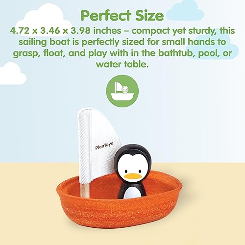 PlanToys® Wooden Penguin Sailing Boat Bath Toy for Toddlers | Montessori Floating Toy for Kids | Eco-Friendly Baby Water Toy for Bathtub, Pool & Water Table