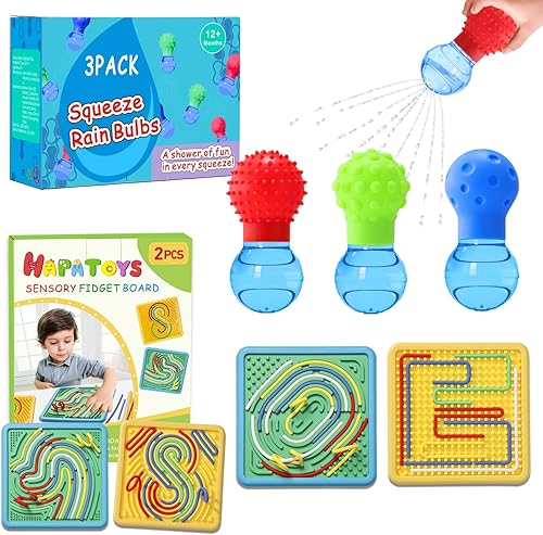 Sensory Toys for Toddlers 1-3 - 3pcs Sensory Squeezing Water Bathtub Toys and 2pcs Double Sided Sensory Activity Board toysfor Kids Boys and Girls