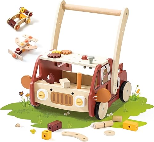 OESSUF 2-in-1 Wooden Baby Walker with 40 PCS Tool Toys – Baby Push Walker for 6-12 Months, Activity Center for Toddlers Aged 1-3 Years, Montessori Toy for Boys and Girls (Red)
