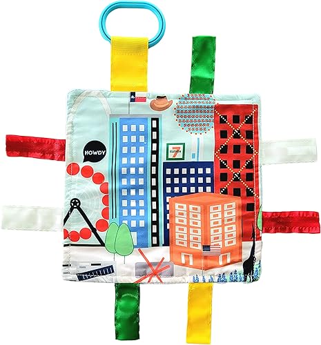 Baby Jack & Co 8x8” Learning Lovey Dallas Texas Tag Toys for Babies - Baby Crinkle Toys - Soft & Safe - Learn USA Cities and Shapes - Ideal Baby Toy & Gift BPA Free w/Stroller Clip