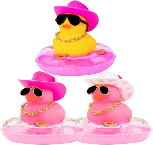 wonuu Swim Ring Rubber Ducks with Diamon/Plastic Sunglasses Necklace Cowboy Hat for Cars Dashboard Decorations Car Accessories Duck Car Ornament, Yellow+Pink+Pink