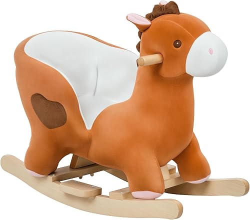 Qaba Kids Ride On Rocking Horse, Plush Animal Toy Sturdy Wooden Rocker with Songs for Boys or Girls
