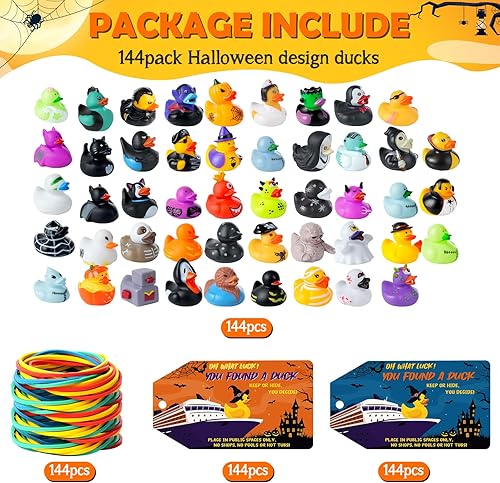 Packing Include:Our 24 set Halloween cruise ducks kits includes 24pcs no repetitive rubber ducks 24pcs cruise tags and 24pcs rubber bands,72 pieces in total,that are perfect for your Halloween goodie bag fillers and party favors.