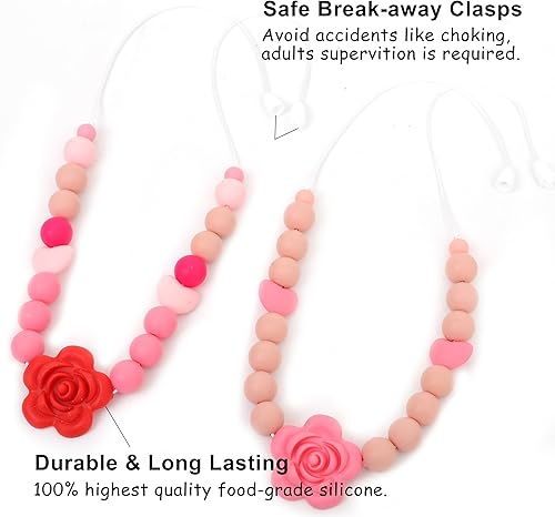 NURSING SILICONE NECKLACES: The pink and red rose flower shape is not only romantic and elegant, but also attracts your little one's attention. They will keep little hands happy and out of your hair, making breastfeeding a smooth process
