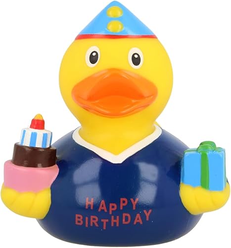 Whimsical Design: This 3-inch blue rubber duck features birthday hat, cupcake, and boxed present.