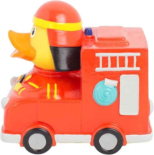 Whimsical Design: This 3-inch Red, Yellow, Black fire truck with yellow duck driving.