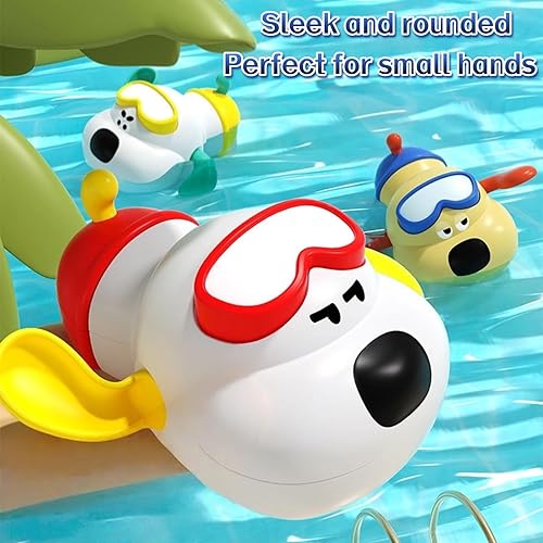 This bath play set includes 3 adorable puppies toys in red, blue, and yello. There are perfect water toy bath toy for toddlers 1 2 3 4 5 years old