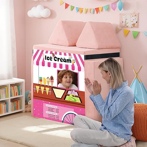 Four-Themed Play Panels: This imaginative play panel includes 4 themed panels: Car Wash, Ice Cream Shop, Supermarket, and Fire Station (each 33.5” x 37”), plus a 12ft adjustable strap. Designed for acting, it inspires kids to create actual scenarios that build communication, originality, and social skills. (Note: Play sofa not included)