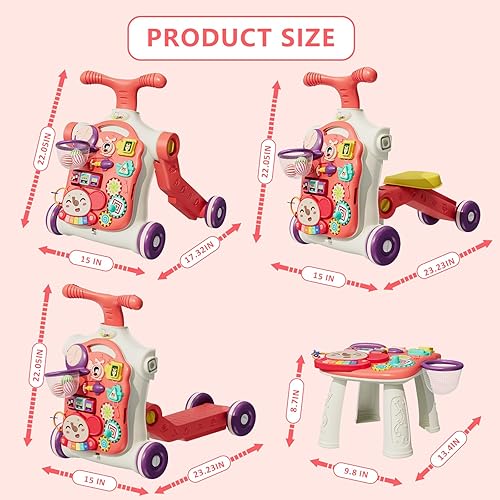 [UPGRADED 5 IN 1 DESIGN] HYES multi-functional sit-to-stand learning walker has 5 modes: baby walker mode, scooter mode, motorbike mode, baby entertainment table and activity center for infant. This push baby walker can not only scientifically guide babies to use their own balance ability and leg muscle strength to lead the way but also let them enjoy upgraded riding fun at any time.
