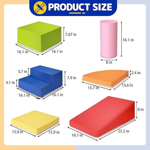 6 PIECE SET: A cylinder, a small rectangle, a large rectangle, a big triangle, a small triangle, and a stairs all with PU leather make up our foam play gym set. Six vibrant colors stimulates toddlers' visual development and allows them to stack and combine freely, allowing their imagination to run wild