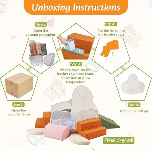 8-piece Foam Climbing Play Set: Our climbing set includes 1 pink half-cylinder module, 2 orange stair modules, 2 green triangle modules, 2 beige half-cylinder modules, and 1 large beige ball pit. The soft modules can create countless combinations, allowing children to enjoy the fun of stacking toys while climbing up and down, and inspiring their creativity!