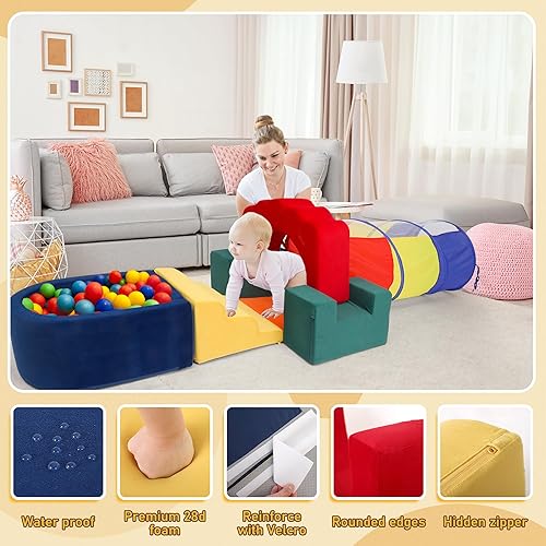 Multi-Functional 8-Piece Set:This toddler climbing toy set includes 8 different modules: a round archway, an arch core module, a ball pit, a three-step wave-shaped staircase, two concave modules, a folding three-panel mat, and a crawling tunnel. This set provides a rich interactive experience that helps children develop motor skills, coordination, and balance. It encourages 1-3-year-olds to stack, arrange, and manipulate foam building blocks, improving their recognition abilities and deepening their understanding of shapes, sizes, colors, and spatial relationships