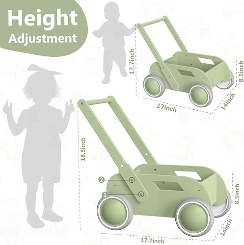 ADJUSTABLE BABY WALKER - The height of our unique design of wood push walker can be adjusted in two stages of 17inch and 18.5inch, and the appropriate height can be selected according to the age of the baby. This toddler walker is Equipped with a handle that is easy to grip, ensuring stability and balance as your baby explores their surroundings