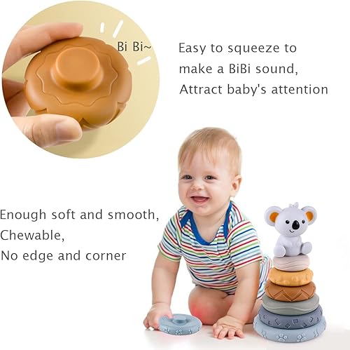 【7PCS Cute Stacking Rings Set】This cute building toy come with a cute animal and 6 different color & size circles. There are fun and engaging for your baby to look at, catch babies eye and develop fine motor skills.