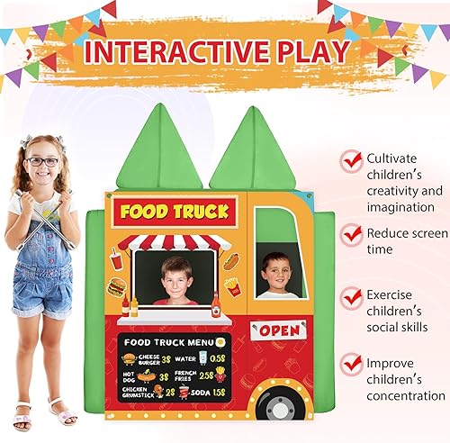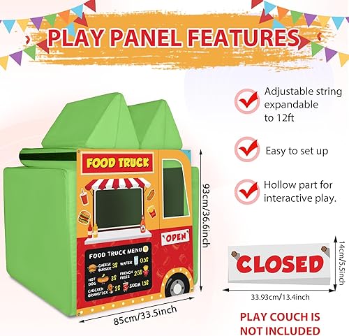 Package Includes: Your child will love the vibrant, food truck-themed play panel (33.6 x 36.6 in), featuring a "closed" sign panel (13.4 x 5.5 in), an elastic string, and a sheet of adhesive dots. This interactive play panel for play couch is great for sparking imagination and role-playing fun in any kids' playroom or home entertainment space.