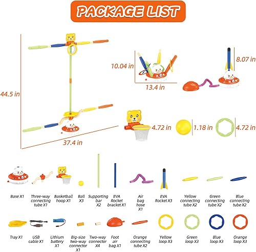 • 5-in-1 Musical Jump & Toss Toy: This versatile 5-in-1 sports outdoors toy combines five exciting games to enhance playtime diversity. Enjoy spinning pole-hopping, spinning ring toss, rocket launcher, Jumping and obstacle avoidance, and basketball throwing! With a single 3.7V 500mAh rechargeable lithium battery, it only takes 60-90 minutes to charge, providing up to 45 minutes of uninterrupted fun