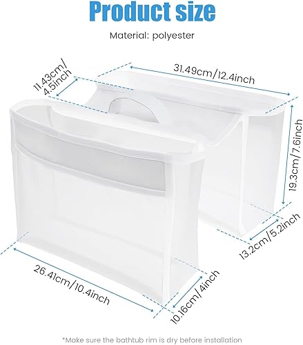 Size and Suitable Tubs: Besides featuring mesh bathtub toy storage, the bath toy holder also has a compartment for extra bath essentials storage. Bath toys storage compartment: L 12.4″* W 5.2″* H 7.6″; Shower bottles storage compartment: L 10.4″* W 4″* H 7.6″. Suitable for bathtub rim width within 4.5″, please make sure your bathtub rim is clean & dry before installation