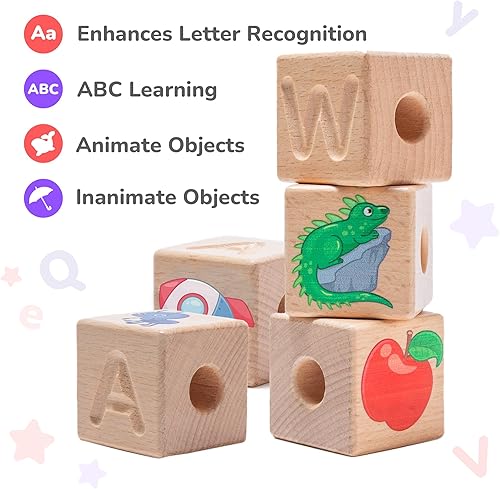 ENGRAVED ALPHABET BLOCKS: Each block has an uppercase letter on one side and a lowercase letter on the other. Kids can lace them using the included wooden needle and bead, enhancing motor skills while learning their ABCs.