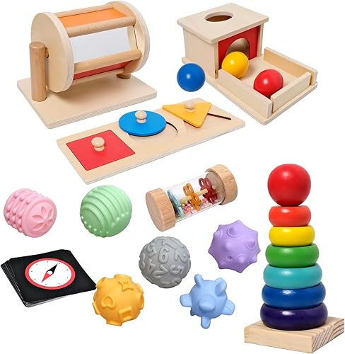 • Engaging Montessori Toys for Babies 6-12 Months: This wooden baby toys set includes 12 sensory toys: ,an object permanence box with a ball, a spinning rainbow drum, a spinning rainbow montessori, a colorful multiple shape puzzles toys,a rain maker toy,a flash card set and 6 sensory balls. These toys support your baby’s sensory development and encourage exploration and play