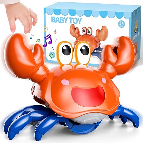 Crawling Crab Baby Toy: It moving fast, skitters sideways like a real crab, and plays fun sounds and music and lights up. When it approaches an obstacle, its sensors reverse direction. Rechargeable and long-lasting: This crawling crab baby toy is equipped with a USB charging port, making it rechargeable and designed specifically for endless fun. Your baby can enjoy hours upon hours of entertainment.