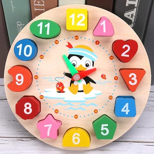 Clock Toy Wooden Teaching Clock Props Penguin Pattern Toys Teaching Time Number Puzzle Stacking Montessori Educational Toys for Toddlers