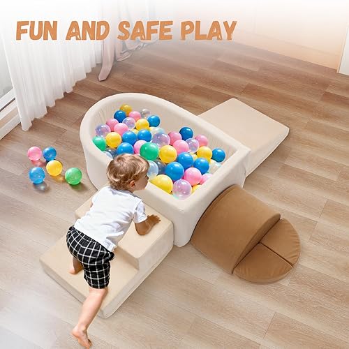 【MULTI-SHAPE VERSATILITY】This toddler foam climbing toy comes with a ball pit, including a ball pit (balls not included), a semicircular ramp, stairs, a slope, and 2 fan-shaped pieces. It can stimulate children's creativity. Kids can learn about shapes, sizes, colors and spatial relationships by stacking, arranging and handling the foam blocks. Plus, climbing up and down the blocks enhances their gross motor skills (balance, coordination, strength and overall physical growth)