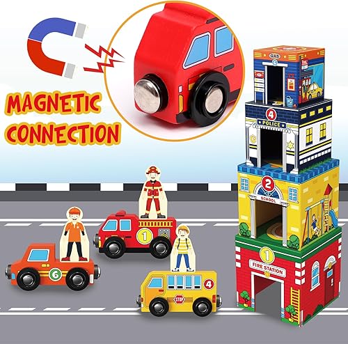 Stacking and Nesting Blocks - Upgraded stacking toys blocks come with 6 nesting boxes including police, hospital, school, fire/ gas/ rubbish station, 6 community helpers and 6 wooden cars with magnets. The stacking building blocks are printed with corresponding occupation images and numbers. Our blocks for toddlers 1-3 can be nested for easy storage