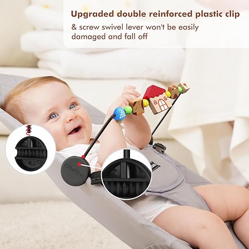 Upgraded Reinforced Plastic Clips: Baby bouncer toy bar with new upgraded reinforced plastic clips, the use of self-developed mold production, reinforced plastic clips contact position and replace the screws rotating screwed in, will not lead to easy to break and detachment of the situation. The plastic clip material is upgraded to frosted material, which is more textured and has no protruding parts. Easier to install and remove
