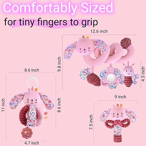 Baby Toys for Car Seat: Bunny plush sensory toys set includes 3 car seat toys for babies 0-6 months girl boy infants 6-12 months - spiral stroller toys with flower, tummy time mirror, carrot, bee; crinkle-eared hanging ball toy with squeaker, different textures, elastic rope hanging a rattle; rattle stick with crinkle paper, squeaky