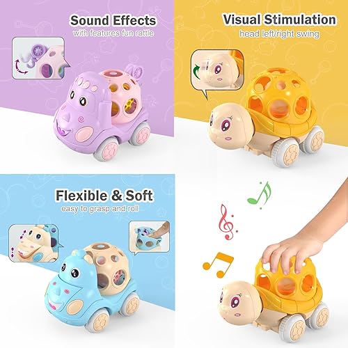 New Style Yellow Rattle and Roll Soft Cars: Our car toy sets have 3 different cute style vehicles, include tortoise, truck and crane. 4.4 inch infant hand push toy,soft, flexible and lightweight, easy for baby to grasp and roll. Cute go gripper cars let baby 6-12 months put it down.