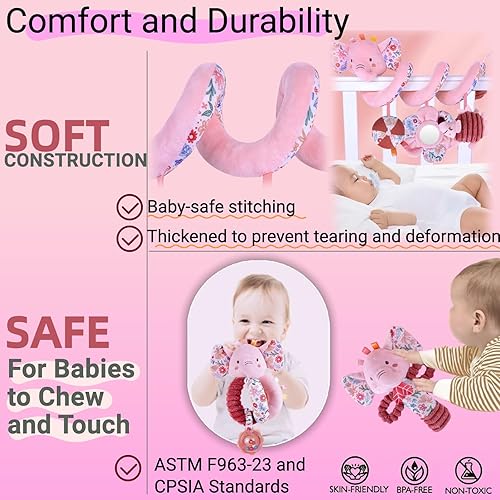 Spiral car seat toy with baby safe mirror (visual tracking & tactile development); Hanging ball toy (grasping skills with 3-texture surface); Rattle stick (auditory development & hand-eye coordination); Covers baby toys 0-2-3 months (mirror exploration) to 3-4-6-9 months (fine motor skill building)