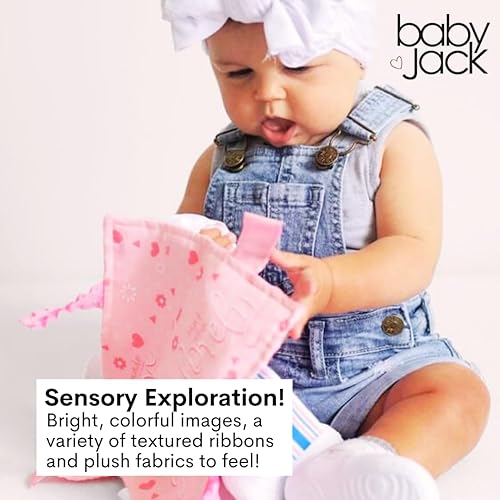 Baby Jack & Co 8x8” Learning Lovey Baby Girl Newborn Gender Reveal Tag Stroller Toy for Babies - Crinkle Toys for Developing Five Senses - Pink Hospital Blanket - Shower Gift - BPA Free Clip