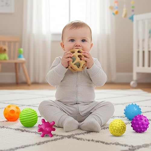 2-in-1 Sensory Bundle: Includes 6 textured sensory squeeze balls plus textured rattle teething balls. Montessori-inspired play boosts tactile, visual, and auditory exploration while encouraging grasping, hand-eye coordination, rolling, and cause-and-effect learning for newborns and babies 6-12 months.