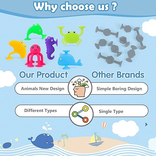 Creative Ocean Animal Suckers: 18pcs Bath animal suction toys are innovative toys with a variety of different colors and shapes, which includes 9 sea animals; dolphin, whale and octopus etc in vibrant colors. Our suction cup toys cling to the wall or bathtub easily and the suction is strong and stable! And stick to each other! These Montessori toys is perfect for parents to interact with kids, Build, stick, connect, and pop these little suckers for hours of fun! It is perfect for easter fillers, easter stuffers, easter items for teens.
