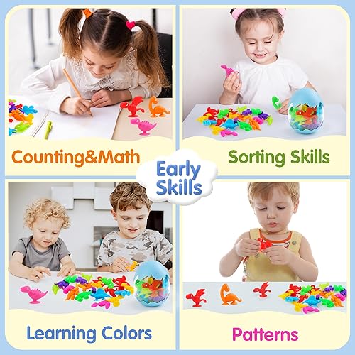 Educational Develop Toys: Just gently unscrew the eggshell lid, our counting dinosaur suction toys are not only designed to help your kids identify 8 different dinosaur species and colors. But also these suction cups improve kid's hand-eye coordination and fine motor skills, enhances visual thinking and concentration, and encourages imagination and interaction.They also make a great relaxation tool for adults and ideal stem toys for 3 4 5 6 year old.