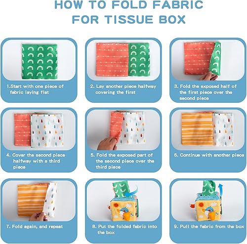 【Ultra-soft Material for Babies】The tissue box is made of cotton which is skin-friendly and odorless. Our infant baby tissue box contains 3 multi-themed cotton tissues & 6 colorful high-quality satin fabrics which are very soft to touch for one-year-old boys and girls. Moms don't have to worry about your little lovers putting a toy in their mouth or getting hurt. The tissue box can maintain its shape well and will not collapse. Easy to wash and carry.