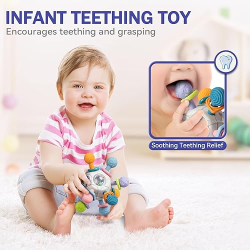 Explore Infant Rattle Teether - Our sensory chew toys are made of non-toxic, food-grade material, allowing babies to explore safely with mouths. Featuring 12 soft rubber tips, it's perfect for 0-12 months toddlers, effectively massaging gums to relieve teething pain. The rattle makes a rustling sound when shaken, and a clicking sound when twisted. Perfect for baby's tiny hands, encouraging grasping and fine motor skills.