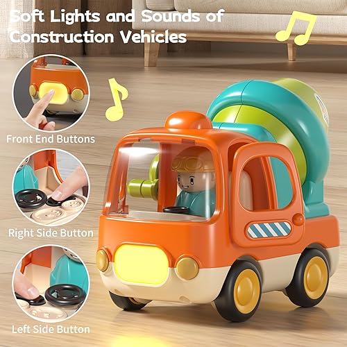 Toddler Cars Fun Pack: Designed for toddlers, this friction powered construction vehicle set includes an excavator, dumper, and cement mixer truck. Each toddler car toy has no rough edges and is equipped with soft lights and playful sounds to engage and entertain your little one