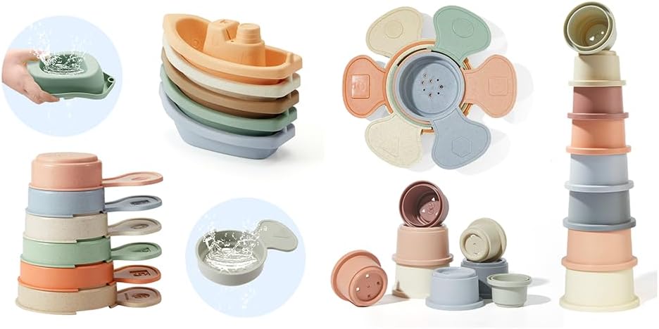 Product 2: Bathtime just got a whole lot more fun with this bath toys of 8pcs stacking cups and 6pcs bathing spoon! These colorful water toys are designed to keep your little ones entertained and engaged during their splish-splashing adventures. unique holes in the bottom for pouring and water play at bath time.