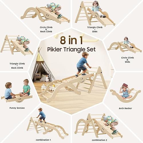 8 Different Combinations: The pikler triangle set includes a wooden triangular, a climbing and sliding ramp, and an arch with a slot design. Young children can enjoy a variety of gaming experiences, exercise balance, and improve creativity