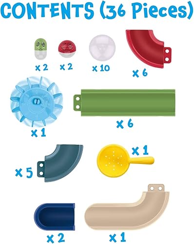 TRANSFORM BATHTIME into a thrilling adventure with our marble run bath set, featuring 36 pieces to build exciting track sets on tubs and tiles for marbles to roll down. Create a colorful track in the tub.