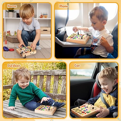 Enhances Sensory & Motor Skills: The OWKJAR Busy Board with LED Light is designed to stimulate toddlers' sensory and motor skills. The light and color design promotes color recognition, hand-eye coordination, and cognitive development. The buttons and switches are perfectly sized for little hands, encouraging independent play and exploration. This educational toy is ideal for toddlers aged 1-3, helping them develop fine motor skills while keeping them entertained during travel or at home.