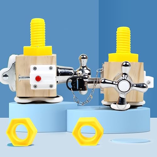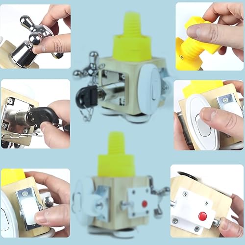 7-in-1 Montessori Toy - This quality wooden interactive toy includes fingertip gyroscope, anti theft safety lock and key, spring bolt, switch, universal wheel, water tap and rotating screw cap. Cultivate children's cognitive, attention and learning ability
