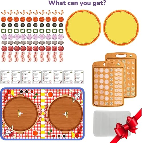 Package Includes: 8 Felt Order Recipe Sheets, 2 Felt Pizza Bases, 2 Felt Cutting Boards,80 Felt Toppings (Mushrooms, peppers, onions, pepperonis, tomatoes, olives,bacons, shrimps),1 Plastic Storage Container,1 Storage Bag.