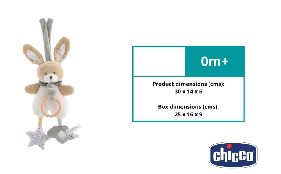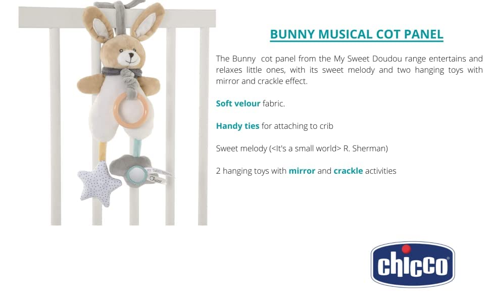 The rabbit music box from the My Sweet Dou range entertains and relaxes the little ones with a sweet melody and two hanging toys with mirror and crackle effect