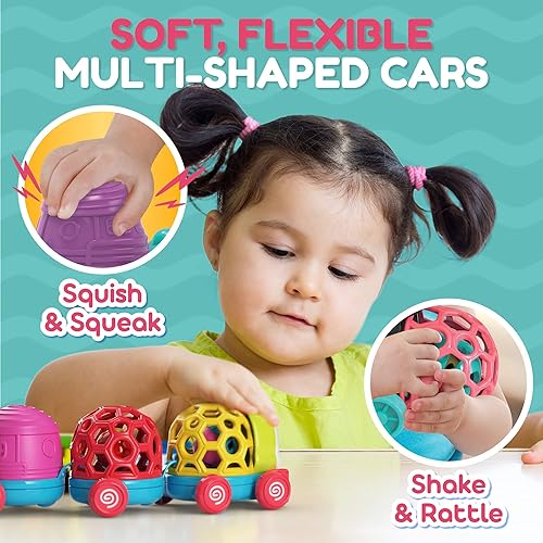 MUSICAL FUN - Bendy the musical car toy features three toy cars with fun music and sound effects to stimulate and attract your little one’s attention; the front car plays music, the squeezable middle car squeaks, and the last car is an adorable baby rattle